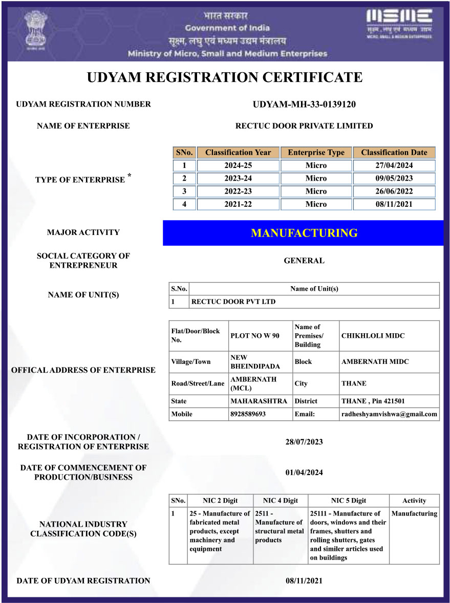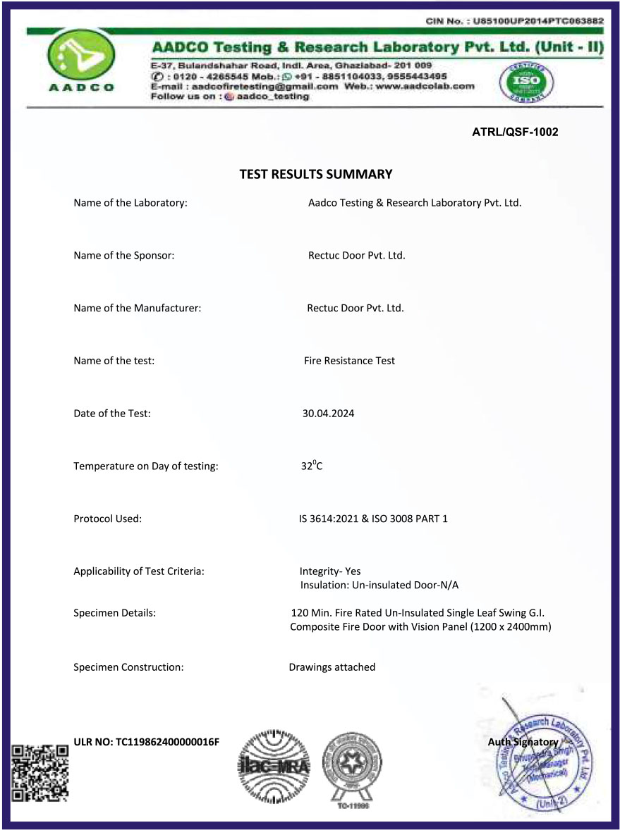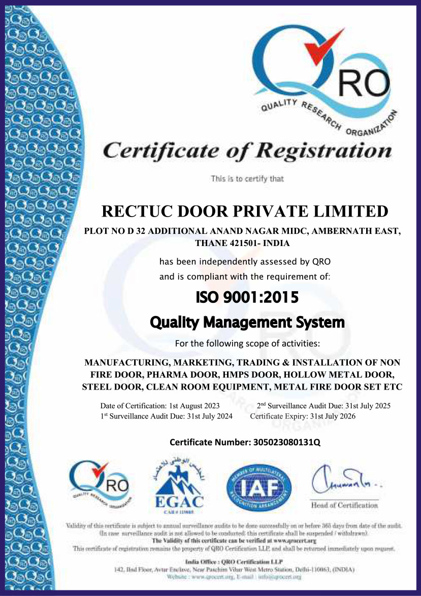 At Rectuc Door, achievements are not just awards — they are proof of our engineering commitment. From ISO 9001:2015 certification to NABL-approved fire-safety lab testing, each milestone validates our dedication to uncompromised quality, innovation, and customer safety. Our certified solutions continue to set new standards in performance across industrial, commercial, residential and institutional applications.